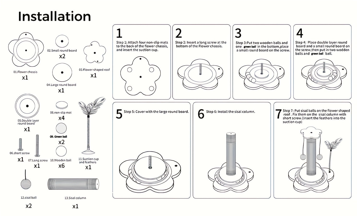 - 4-in-1 design: A tall scratching post, interactive track balls, a fluttering feather toy, and sisal hanging balls for batting and tugging — all in one compact unit.